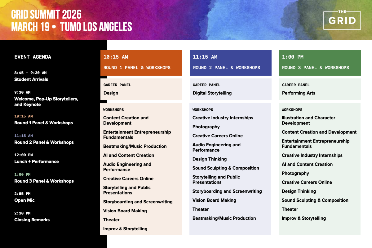 The GRID offers a dynamic mix of sessions to inspire and prepare young creatives for future careers. Students can explore industry foundations through Discover Creative Industries 101, build essential skills in Building Blocks for Creative Careers workshops, hear real-life experiences in A Day In My Creative Career Life panels, and get personalized guidance in Live Career Counseling with Creative Careers Online. These sessions are designed to support students at every stage of their creative journey.